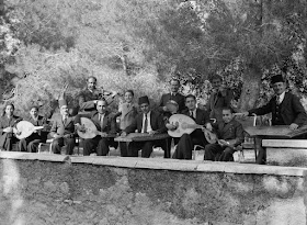 الفرقة الموسيقية لدار الإذاعة الفلسطينية عام 1940 ويبدو بين الجالسين أمير البزق الفنان السوري محمد عبد الكريم